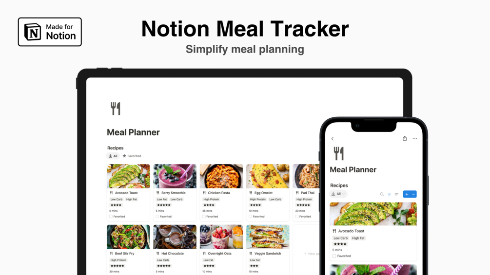 Notion Meal Planner streamlines your entire meal preparation process. Store your favorite recipes with detailed cooking instructions, plan your weekly meals with ease, and manage all ingredients using integrated lists for pantry staples and shopping needs.