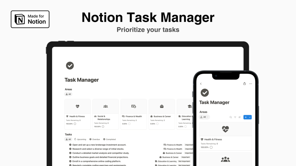 Notion Task Manager helps you organize and prioritize your tasks effectively. Categorize tasks by areas of life, utilize the Eisenhower matrix for strategic prioritization, and manage your deadlines with an integrated task calendar for optimal productivity.